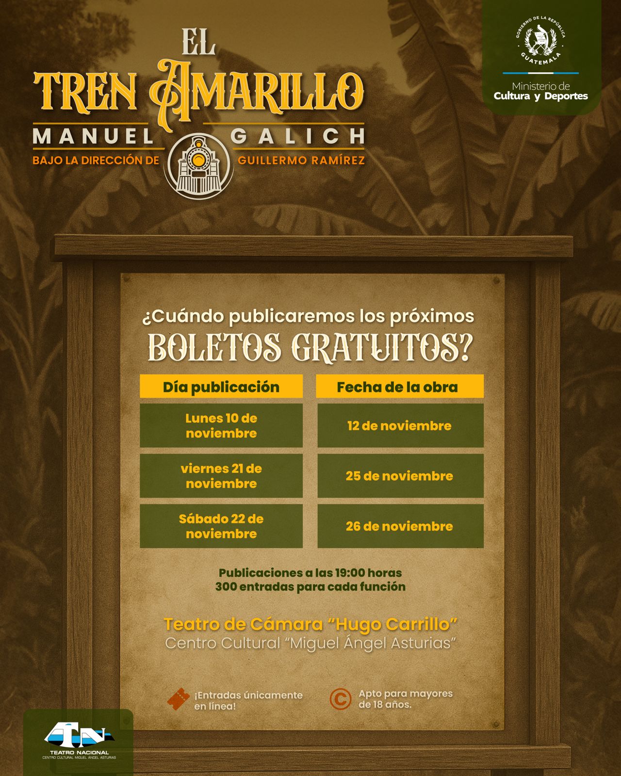 Disfruta de cada una de las funciones 25 y 26 de noviembre. Los enlaces para adquirir tus entradas serán publicados en las distintas redes sociales del MCD: Facebook, Instagram, TikTok y X. Todas las fechas son gratuitas y solo habrá 300 butacas disponibles.