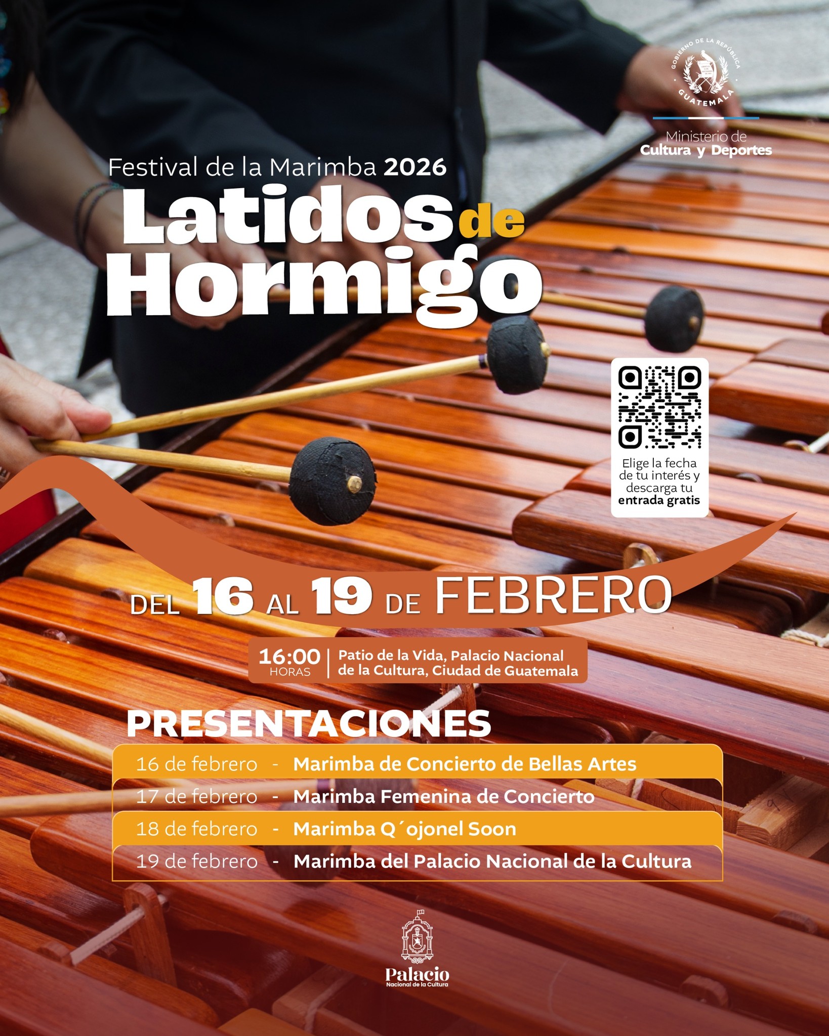 Disfruta de los “Latidos de Hormigo” que trae el Festival de Marimba 2026. Cuatro conciertos y cuatro conjuntos artísticos preparan el camino para la gran celebración de nuestro instrumento nacional este 20 de febrero.
