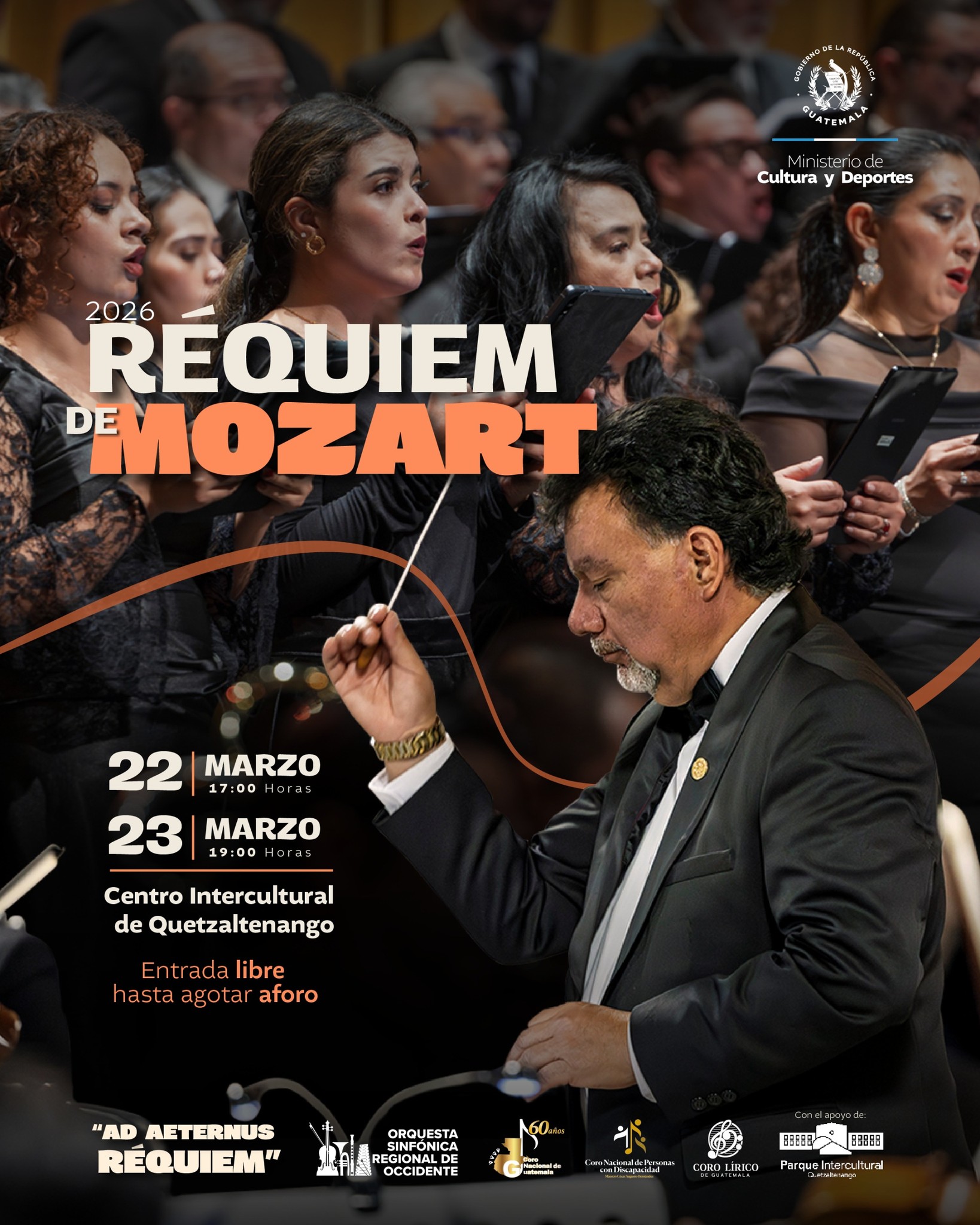 La Orquesta Sinfónica Regional de Occidente llega al Centro Intercultural junto al Coro Ad Aeternus, conformado por el Coro Nacional de Guatemala, el Coro Nacional de Personas con Discapacidad, el Coro Lírico de Guatemala y el Coro Externo, de artistas que audicionaron para la Temporada Coral Sinfónica, para interpretar el Réquiem de Mozart bajo la dirección del maestro Marvin Ardany López.