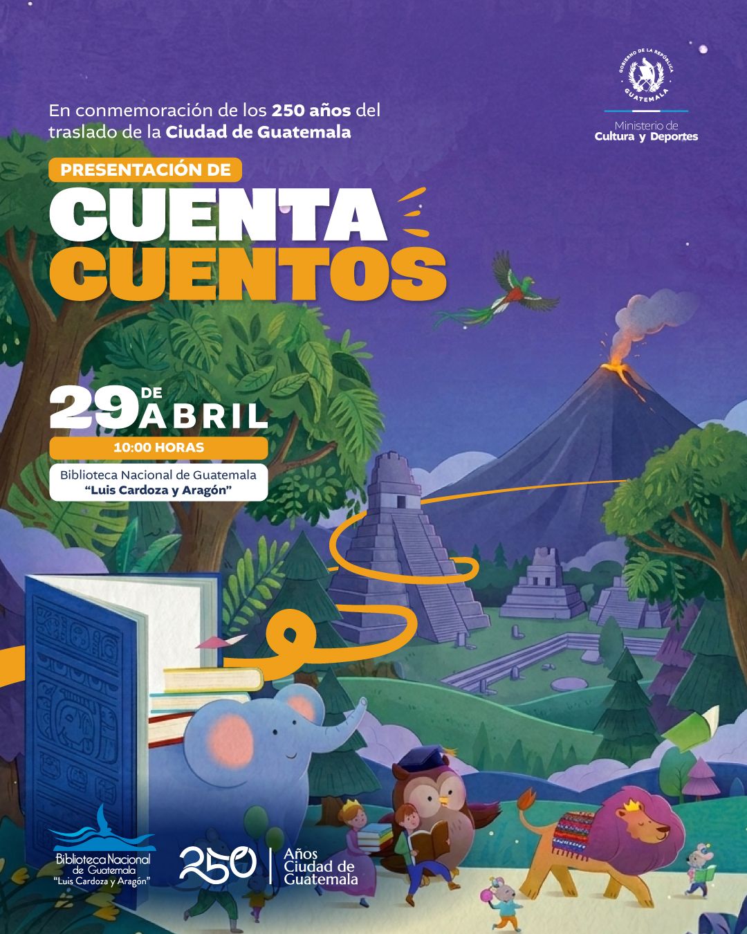 Te invitamos a disfrutar de una mañana llena de imaginación y aprendizaje con nuestra presentación de cuentacuentos, en conmemoración de los 250 años del traslado de la Ciudad de Guatemala.