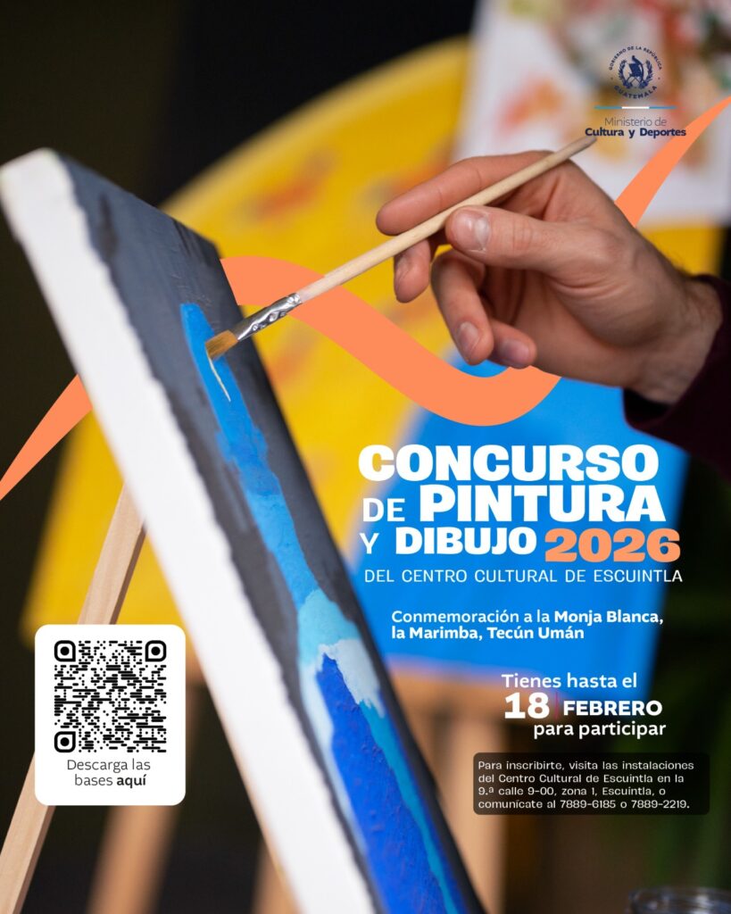 El Centro Cultural de Escuintla te invita a participar en el Concurso de Dibujo y Pintura 2026. Plasma tu creatividad y rinde homenaje a nuestros símbolos patrios: Marimba, Monja Blanca y Tecún Umán.