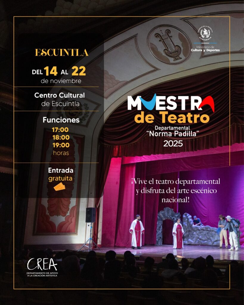 ¡Vive el teatro departamental! Por segundo año consecutivo la Muestra de Teatro Departamental «Norma Padilla» hará vibrar las tablas del interior del país. Espérala de 14 al 22 de noviembre en el Centro Cultural de Escuintla, funciones: 17:00 – 18:00 – 19:00 horas. Entrada gratuita.
